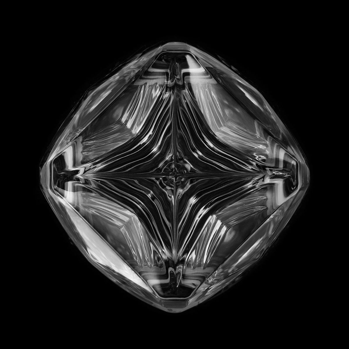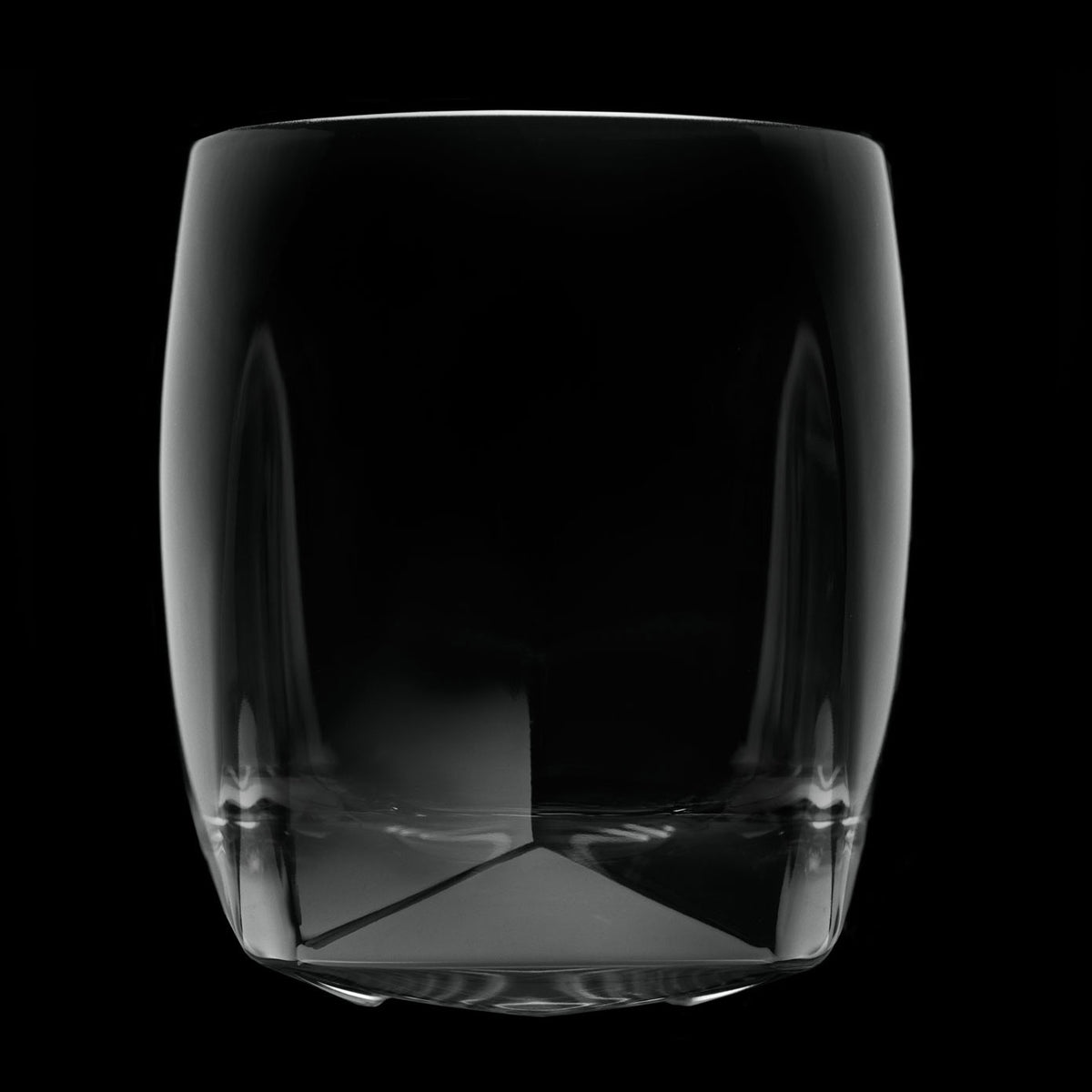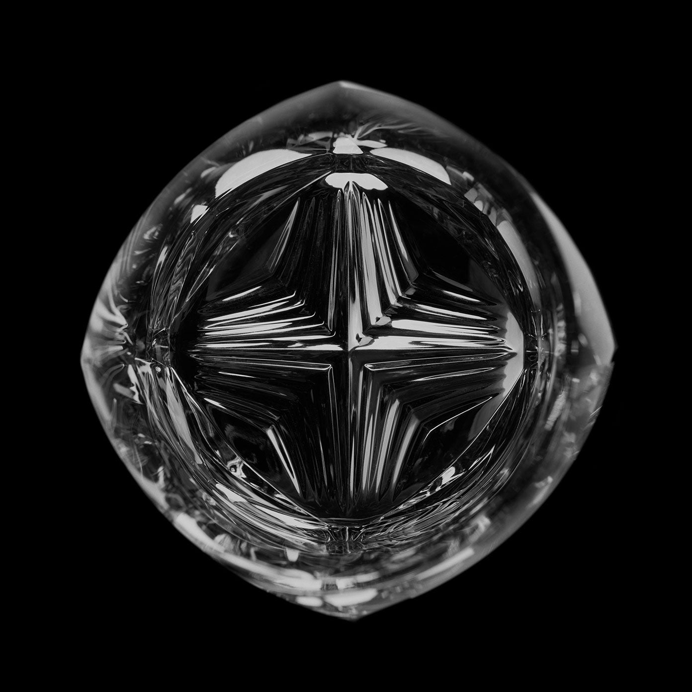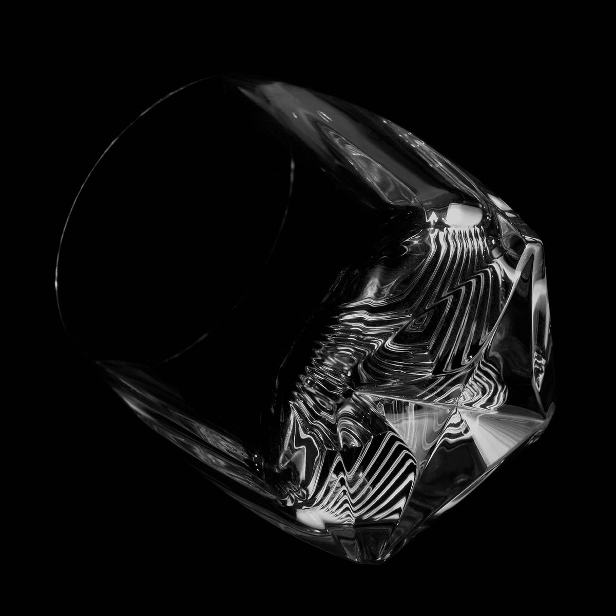 Foregoing the ornamentation of cut crystal, the entire surface of the tumbler, inside and out, is born in a single blinding moment of machine-pressing the molten non-leaded crystal into a complex five-part mold. The result is a pure expression of material and form that elevates the traditional lowball glass to new heights, with geometric facets and edges blending organically into curved surfaces that fascinate the eyes and play with the sense of touch.